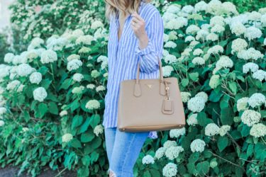 Summer Outfits Blue Pinstripe Shirt Rails Pinstripe Shirt Levis Ripped Denim similar Leather Mules Prada Saffiano Tote Ray Ban Sunglasses Michael Kors Rings c/o (gold spiral ring & crisscross… Read More