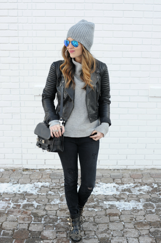 Bundled up in some cold weather favorites including this French Connection leather jacket and oversized sweater that I wear way too much. I added this grey beanie to the mix and pulled out a favorite pair of old studded boots from a few years ago. I love remixing some of my favorite pieces to make them feel new again!