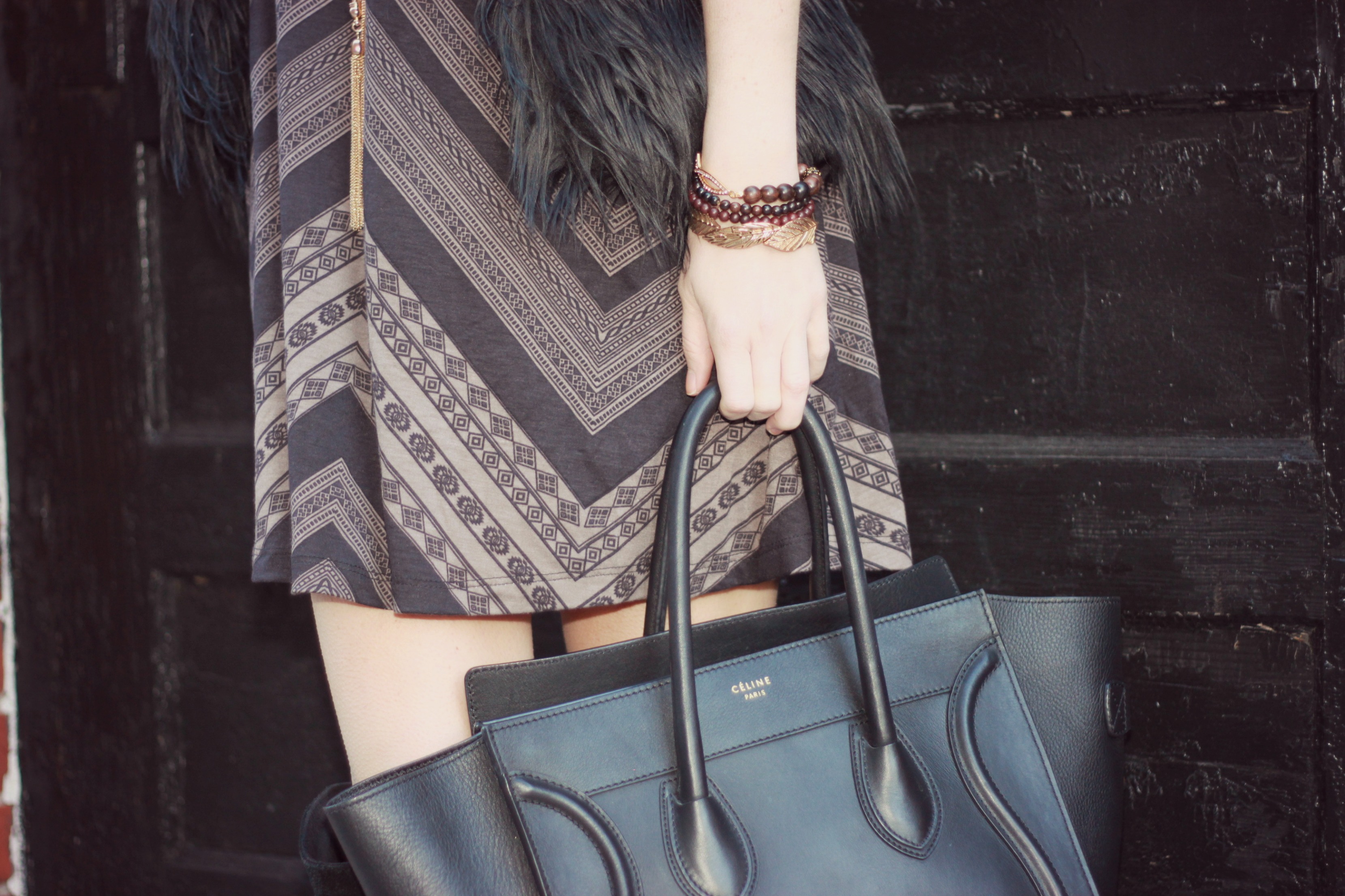 {Fur Vest: c/o Karen Kane (old, similar) || Dress: c/o The Impeccable Pig || Boots: Nine West (old, similar) || Bag: Celine || Sunglasses: Ray Ban || Tassel Necklace: Forever 21 (bought in store, similar) || Bracelets: c/o Chasen Jade Jewelry}