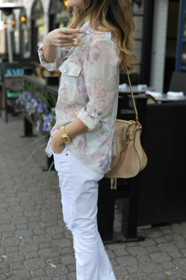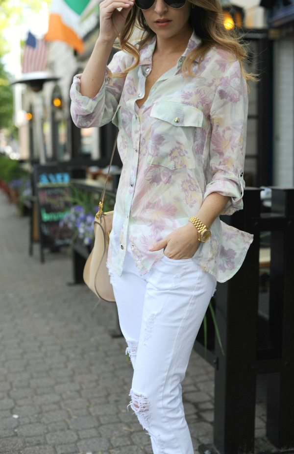 Sometimes I’m all about slouchy for the win, case in point, this double boyfriend fit look that keeps me cool and comfortable in this recent heat. I had last paired this floral boyfriend shirt when it was so cold, I was almost blowing over. I love the print and the details on it (plus the under $100 price tag doesn’t hurt). These James Jeans distressed pair run slightly large so I recommend sizing down (unless you plan to wear them a little on the slouchy side like I did here). I’m wearing my regular size here so they fit like boyfriend jeans.