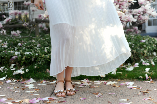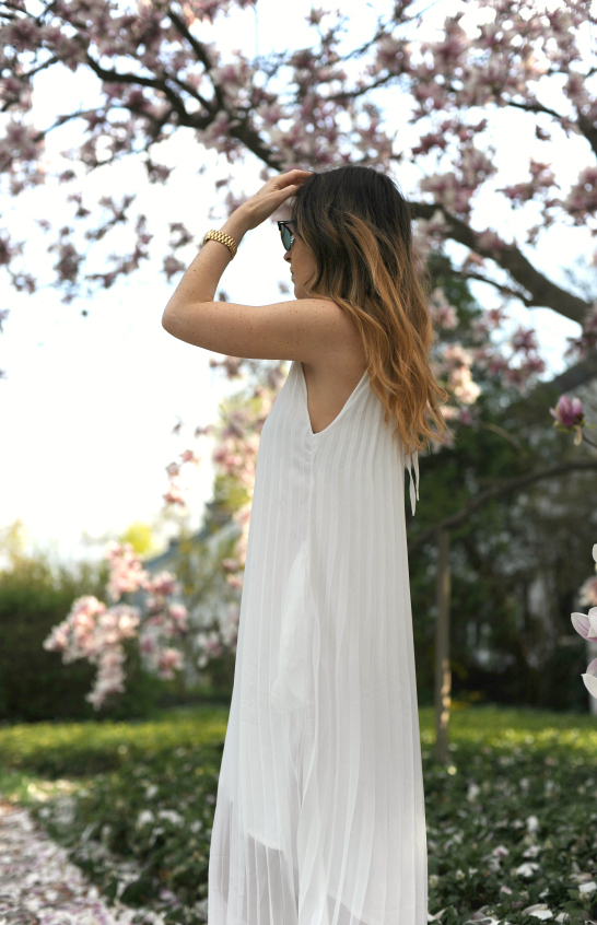 The amount of white dresses I had in my closet before we got engaged was already high, but now I just can’t stop. This was a potential bridal shower dress for me but I just couldn’t wait to wear it! The high suspended neckline reminded me of this dress and makes it beyond comfortable. I wore it this past weekend as Raj and I stumbled across this beautiful neighborhood down the street from our house. Sure, this tree is beautiful but I am paying for it now! My allergies are insane this week but I will not complain… it’s going to be about 85 degrees for the foreseeable future!