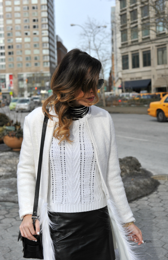 {Jacket || Turtleneck || Sweater c/o Santuary Clothing || Leather Skirt || Tights || Booties || Bag || Sunglasses}
