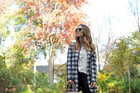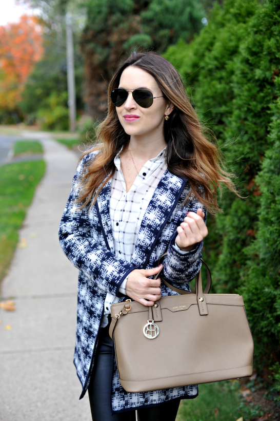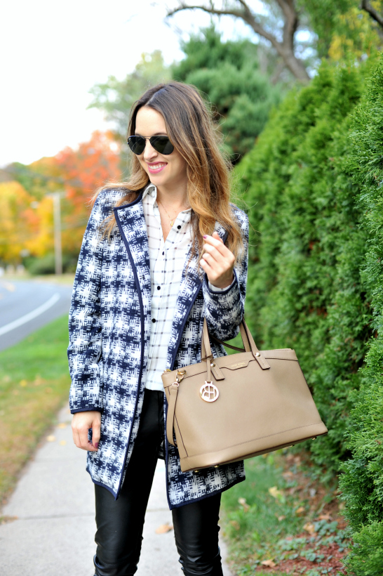 {Tweed Jacket: c/o Old Navy (runs large, size down) || Plaid Blouse: c/o Old Navy || Faux Leather Pants: Zara (old, similar here) || Booties: c/o Joie || Bag: c/o Henri Bendel || Sunglasses: Ray Ban || Necklace: c/o Brooklyn Designs}