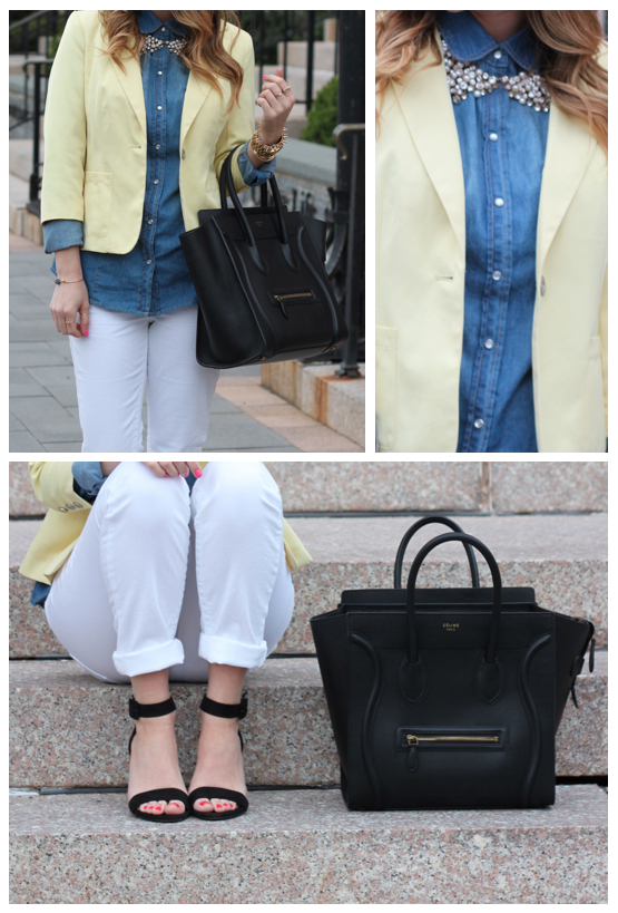 {Blazer: Forever 21 (old) || Chambray Shirt: c/o Ali & Kris || Jeans: c/o Silver Jeans || Heels: Zara || Bag: Celine || Sunglasses: Ray Ban || Necklace: Forever 21 || Bracelets: c/o BFREND, c/o Stella & Dot || Rings: c/o delia langan, c/o Amarilo}